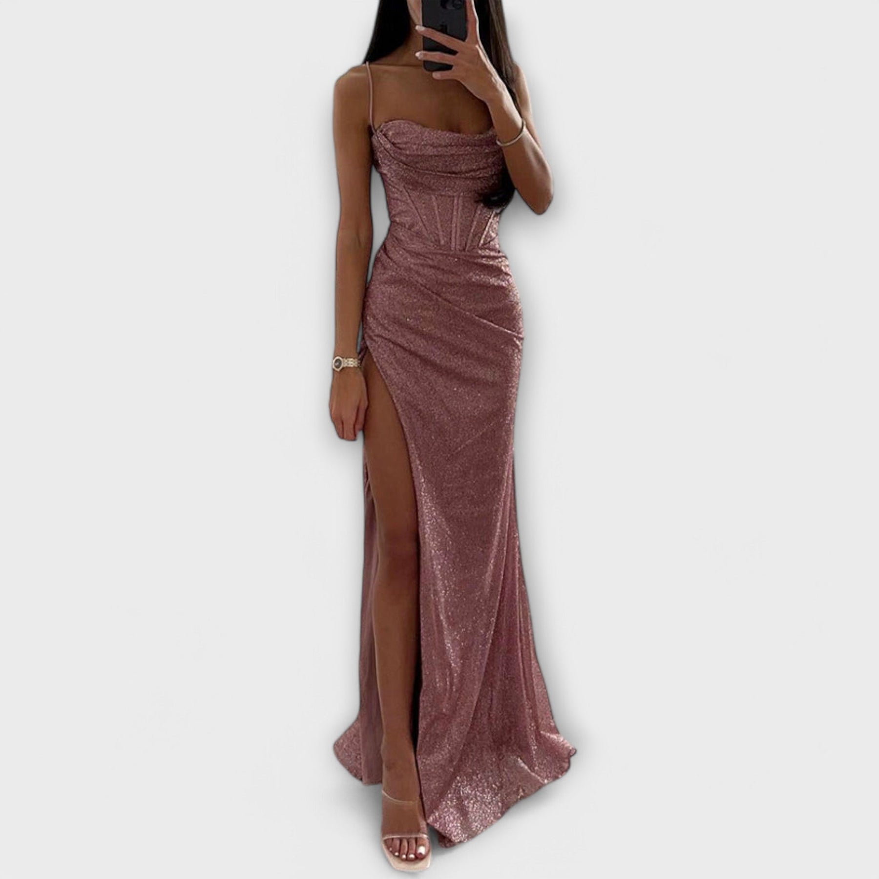 Rafinovaná a Svůdná Elegance: S tenkými ramínky, výstřihem ve tvaru srdce a přizpůsobeným střihem, tyto šaty dokonale zvýrazňují ženskou siluetu. Vysoký rozparek přidává odvážný a stylový nádech, zatímco jemný lesk vytváří luxusní efekt.
