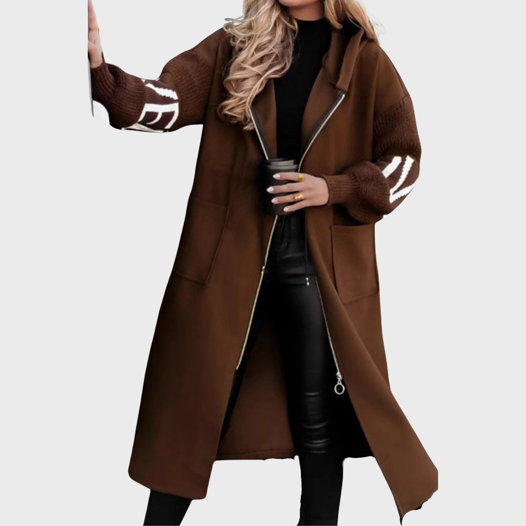 Henryka™ – Dlouhý kabát s pletenými rukávy a kapucí